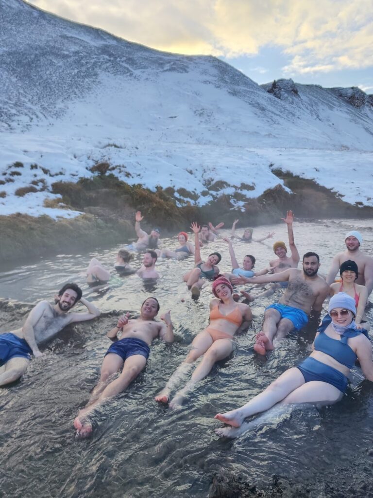 On the second day, we had the chance to get to know each other better. First in a short input session near our hostel in Reykjavík, and later on out in the wide nature. We hiked together through the Reykjadalur Valley, an impressive trail that leads to a natural hot spring. After the strenuous climb through the snow, we took a hot bath under the open sky in a natural hot spring at sub-zero temperatures. What a fascinating natural spectacle. In the presence of the fresh and white snow, the warm spring felt even more impressive.