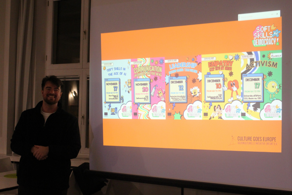 On 27 January, Culture Goes Europe e.V. (CGE) organised the final event of the Erasmus+ project SoftSkills4Democracy (SK4D) with a Networking Evening at the International Café of the University of Erfurt. The evening brought together student groups, NGOs, youth initiatives, and community actors to share their work and explore opportunities for cooperation, volunteering, and participation.
