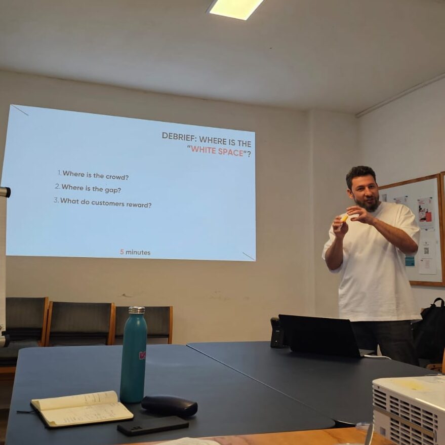 The workshop then introduced practical tools for positioning, including the use of a positioning map to analyze competitors and identify gaps in the market. Participants mapped their own ideas and explored opportunities to differentiate themselves. Building on this, the concept of “category-of-one” thinking encouraged them to define highly specific niches and move away from broad, saturated categories. An exercise on micro-categorisation helped participants refine their positioning further.